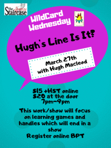 Workshop-Hugh's Line Is It? Hugh is going to guide you through the STEPS in performing handles and games on stage. The workshow will consist of a 2hr improv workshop using the games you might have seen on TV's Whose Line followed by a 30 min Showcase performing the games you learned during the workshop. Unscripted/Uncensored. Class limited to 12. Bring friends for the show. Show is free.