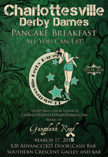 Please join the Charlottesville Derby Dames in collaboration with The Southern Crescent for CDD's All You Can Eat Pancake Breakfast Fundraiser! Start off your St. Patrick's Day festivities with unlimited pancakes, 1 side (bacon, sausage or fruit salad) and 1 drink (orange juice, apple juice or coffee). There will also be live music and a cash bar available!