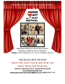 The Atascadero High School Theater Arts is proud to present the 2019 Spring One-Act Festival, an exciting collection of one-act plays! Featuring originals such as "Swim Foerver in the Erne" authored by a local playwright Wendy-Marie Martin. as well as "Cheating Death", "Gossip" and "La Mouche." Each performance features a collection of four different one act plays that showcase humor, passion, suspense and all peppered with a touch of The Twilight Zone. Directed by Shawna Volpa, this festival is not to be missed!