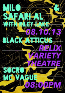 Here at Smash Cut Magazine(smashcutmag.com), we love that rappity-schmappity, hippity-happity sound. As our online pop culture publication begins to move into holding events such as concerts and film screenings, it's natural that one of our first events would be part of a tour put on by two of our favorite upcoming rap artists, Milo and Safari Al. In addition to these two weirdo rap wunderkinds, we've added a few more regional names to the bill. We've invited along the beloved Knoxville rapper and slam poet Black Atticus, the Southern-class-meets-Euro-trash muzick maniac SoCro, and the self-described "Jacques Cousteau of hip-hop" MC Vague. This concert will be held at Relix Variety Theatre in Knoxville, Tennessee on August 10th at 8:00 PM. Tickets are ten dollars. There's a high probability this will be the finest rap show East Tennessee has ever seen, so don't miss it.