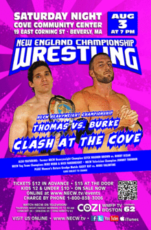New England Championship Wrestling returns to live action with CLASH AT THE COVE at the Cove Community Center, 19 East Corning Street, MA on Saturday night, August 3, 2013 with a 7 PM bell time! In the main event, NECW Heavyweight Champion, Antonio "The Promise" Thomas defends his against the former champion, Sean Burke who recently made a shocking return! Other stars signed to appear include, NECW Television Champion, Johnny Thunder, former NECW Heavyweight Champion Slyck Wagner Brown and much more to be announced! Tickets are $12 in advance, $15 at the door. Kids under 12 are just $10.