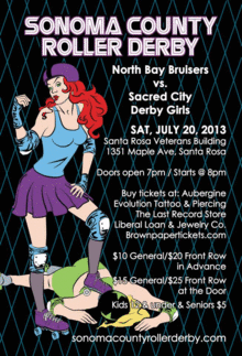 Come out and watch Sonoma County Roller Derby's North Bay Bruisers take on the Sacred City Derby Girls on July 20th at The Veterans Memorial Building in Santa Rosa(across the street from the fairgrounds).