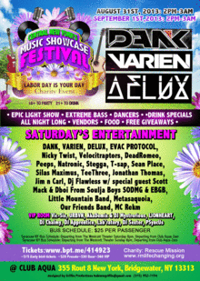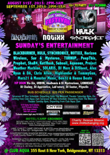 ~Club Aqua~ ~355 Route 8, Bridgewater, New York 13313~ ~August 30st - September 1st~ ~2:00pm-3:00am ~ 2:00pm-3:00am ~ 2:00pm-3:00am ~ ~18+ to party 21+ Drink~ ~Epic light show~ ~Extreme bass~ ~Dancers~ ~Food~ ~Drink specials all night long~ ~FREE giveaways~ ~Vendors~ ~$1 of each ticket sold will go to charity~ ~Birthdays in the month of September get a special gift and half price admission~