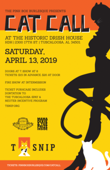 Tuscaloosa's own Pink Box Burlesque is back at the Historic Drish House on April 13th with "Cat Call", a Charity Fundraiser for Tuscaloosa Spay & Neuter Incentive Program!