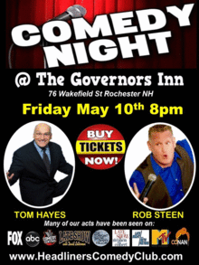 We've got a great night of comedy coming with headliners Tom Hayes and Rob Steen ... all part of the Headliner's Comedy Club acts across New England. A dinner option is available just before the show.