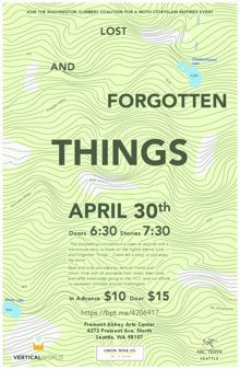 Join the Washington Climbers Coalition and Vertical World for a Moth StorySLAM inspired event. This open-mic storytelling competition is open to anyone with a five-minute story to share on the nights theme (forgotten and lost). Come tell a story, or just enjoy the show!