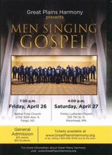 Enjoy an evening of Great Gospel Music sung by Great Plains Harmony and it's quartets. Featuring renditions of classic hymns, newer contemporary and arrangements of some of your favorite songs growing up with a modern twist.