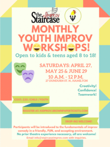 Do you or someone you know, know a young student looking to try something new and spontaneous.Staircase Improv is the perfect place for young creatives and storytellers to use their imaginations, grow their abilities, and laugh their way to new skills! Improv offers kids and teens alike the chance to joyfully explore their creativity, develop confidence and work collaboratively not to mention, it an awesome way to make friends and have fun! In this interactive workshop, open to children/ youth aged 8 to 18, we will explore the fundamentals of improv comedy in an accepting, FUN, and sure-to-be hilarious environment! Groups will be organized by age, according to the number of participants present on the day of the workshop. No prior theatre experience necessary. All are welcome! Registration HIGHLY recommended. 10 a.m. to 12 p.m. April 27th $20 per child/ youth 27 Dundurn St. N. Hamilton, ON About the Instructors: Adriana Alfano has been improvising at the Staircase since 2013, and is a founding member of the Hamilton improv comedy troupe, The Understudies. She is an elementary school teacher with the HWDSB, and regularly uses improv techniques to help her students develop active listening, flexible thinking, and language skills. Scott Thompson has been performing Improvised Theatre for almost ten years, and teaching it for four. He is a founding member of Paper St. Theatre Company in Victoria, BC and now teaches regularly with Staircase Improv in Hamilton, ON. He is currentlyteaching the STEPS Fundamentals curriculum at the Staircase.