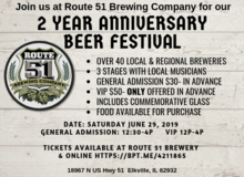Join Route 51 Brewing Company along with many other Breweries for their 2 year Anniversary Beer Festival. Our tasting room, banquet hall, and beer garden will be open with over 30 breweries, live music on 3 stages, and many food options will be available.