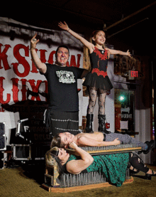 AS SEEN ON TV - the first family of sideshow, The FreakShow Family is a REAL family: 1. REVEREND TOMMY GUNN - the patriarch of the family is the founder of the FreakShow Deluxe and the Best Talker On the West Coast. 2. MISS MALICE AFORETHOUGHT - the Queen Bee of Sideshow runs a tight ship during the dangerous acts. She is mad, bad, & dangerous to know. 3. GRENNAN THE GREEN MONSTER - this 13-year-old is the World's Youngest Professional Knife Thrower - and has been performing over 7 years. 4. LA PEQUEÑA ARAÑITA - the Most Dangerous Little Girl On 3 Continents, at only 11-years-old, has been on stage practically since the day she was born.