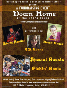 Fayette Opera House and the Bean Creek Valley History Center will present the bi-annual fundraising event Down Home at the Opera House, located at the Fayette Opera House, 105 E. Main Street, Fayette, Ohio. Local area artists performing for this event will be Steve Snider, singer and guitarist who will double as your emcee for the evening, a fan favorite J.D. Evans who will delight the audience with her smooth voice and country sounds and new to out stage is Crooner, Brock Hayes. Brock is a 21 year old who loves the old classics such as Frank Sinatra, Dean Martin and Sammy Davis, Jr. and will bring a new twist to our Down Home Show.