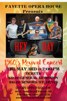 Band members Rick Spitler "Dano" Drums, Jerry Spitler "Jerbear" Keys, Rick Thomas.- "RT" - lead guitar, Mark Hoffman - "Hoffy" guitar, Denis Gale - "The Dude" - Lead singer, and Sean Grindle - "Sean "PAUL" bass, will perhaps bring in some classic country songs from that era as well. Great slow dance music and tunes to rock out on. Hey Day will have you dancing in the isles. Come out and have some fun!!