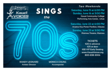 Tickets for Kauai Voices Sings The 70s are $20 in advance, $25 at the door and $30 for VIP Early Seating.