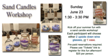 Kick off your summer fun with a sand candle workshop! Each participant will choose either 2 upside down wine glasses, or 1 vase.