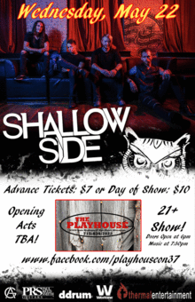 Shallow Side takes over The Playhouse s7650 State Highway 37 Eau Claire Wednesday, May 22! This is their 1st time at The Playhouse! Shallow Side is a main stage act at this years Rock Fest! You won't want to miss this Rock Show at The Playhouse! 21+ and opening acts TBA!
