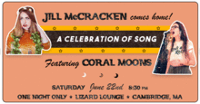 Saturday 6/22 - A CELEBRATION OF SONG JILL McCRACKEN and CORAL MOONS $10 advance / $12 at the door 8:30 doors / 9:00 show https://www.jillmccracken.com https://www.coralmoons.com