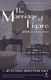 The UNCG School of Music, Theatre and Dance presents The Marriage of Figaro, based on the stage comedy by Pierre Beaumarchais, La folle journee, ou le Mariage de Figaro and composed by Wolfgang Amadeus Mozart. UNCG's production entertains audiences with a sleek "Downton Abbey" theme and design.