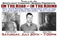 The Spotlight Concert Series is thrilled to announce the second concert of the season featuring three award winning singer songwriters on Saturday, July 20th at 7:00PM. Join us for "On The Road and In The Round" featuring Amy Fairchild, Jesse Terry, and Michael Logen. This intimate concert experience will allow you to enjoy performances of songs by those who wrote them as well as interpretations of songs that have inspired them. Be prepared to laugh and (possibly) cry as they bare heart and soul sharing stories behind their own original songs.