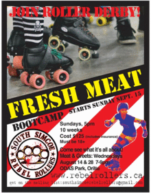|  | EventSouth Simcoe Rebel Rollers Fresh Meat Bootcamp Fall 2013ROLLER DERBY IN BARRIE! You may have seen a poster, caught it on TV or heard it from your cousin out of town, but there's roller derby in Barrie and we'd love for you to join! Not sure if it's for you? Come on out to our Meat and Greet and check it out with a few friends for free!