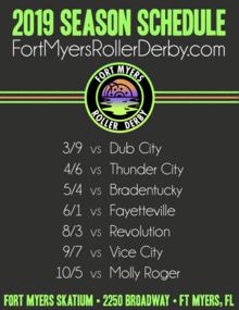 Ft. Myers Roller Derby, Inc. is a not-for-profit organization that is comprised of dedicated athletes, ages 18 and up, from Lee, Sarasota, Charlotte and Collier Counties, that play the sport of roller derby utilizing good sportsmanship and intense competition. The members of Ft. Myers Roller Derby follow the rules set forth by the Women's Flat Track Derby Association (www.wftda.com). Their website is: FortMyersRollerDerby.com