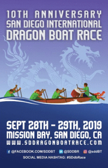 It's our 10th Anniversary! Don't miss out on the great competition in "America's Finest City" during the 10th Anniversary San Diego International Dragon Boat Race set for Sept. 28-29 at Tecolote Shores Mission Bay.