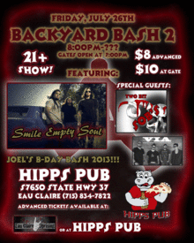 Hipps Pub is proud to present National Touring and Recording Artists "Smile Empty Soul" for Backyard Bash 2 Friday, July 26th! Special Guests: Two Bit SOB's and VIA! Come see Smile Empty Soul with their hit song "Bottom of the Bottle". This is a 21+ show, Gates at 7pm, Music 8p-11:30pm! Hipps Pub is located just minutes outside of Eau Claire City Limits. Hipps Pub s7650 State Hwy 37 Eau Claire, WI 54701 (715) 834-7822.
