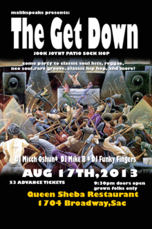 MUSIC IS THE CENTER OF OUR LIVES AND CULTURE, AND WHAT BETTER WAY TO LIVE THAN WITH A CELEBRATION OF SUCH? ON AUGUST 17TH, SEVERAL DJ'S WILL COME TOGETHER AND PRESENT TO YOU A NIGHT OF MUSIC, FROM RARE GROOVES, TO REGGAE,SOCA, CLASSIC HIP HOP,NEO SOUL, ETC.....QUEEN SHEBA RESTAURANT IS GRACIOUS ENOUGH TO OPEN THE PATIO FOR US TO KICK IT ON....COME THRU AND GET YOUR MIND RIGHT....ONLY $3 BUCKS