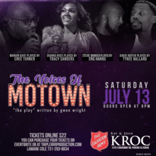 The Voices Of Motown Play was written by Gwen Wright and produced by Rickey R. Robinson. Barry Gordy is played by Raymond Carter narrating the history of Motown. Diana Ross is played by Tracy Sanders singing all her songs. David Ruffin is played by Tyree Ballard singing all his songs, Marvin Gaye is played by Cree Turner singing all his songs, Stevie Wonder is played by Eric Harris singing all Stevie songs. Together they will relive the Motown relationship with Barry Gordy. Tickets, TripleRRRproduction.com Call Rickey for more info call Rickey 708-657-7485 or Lamark 731-293-8834