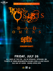 Born of Osiris returns to Spokane for their first headlining show in the area joined by Bad Omens, Spite and Kingdom of Giants to deliver some summer heat on a Friday night! This is one not to miss following the recent release of "The Simulation" album from Born of Osiris and Spite coming in hot after gaining some momentum in the last couple of years.