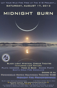 The midnight ritual fire performance will include local fire performers and the Santa Cruz Fire Conclave. The Santa Cruz Fire Conclave, a professionally produced and choreographed fire troupe, has performed at Burning Man for over 10 years and will be the featured outdoor performers.