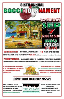 C.I.A.O's Sixth Annual Bocce Ball Tournament, Picnic & BBQ will be held on September 7 on the Front Lawn at the Village at Grand Traverse Commons. Guests are encouraged to bring a dish to pass and their favorite drink. Water and lemonade will be provided.