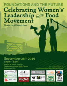 A day of education, celebration and dialogue, this 4th annual symposium intends to acknowledge, celebrate and lift up leaders who are women identified, trans, queer, Indigenous, Black, people of color, and whose identities intersect and transcend these categories. All humans are welcome to participate. The day will focus on nurturing connections to strengthen our collective movement through inter-generational dialogue weaving together policy, advocacy, justice, art and farming. The day features prominent speakers from around California, breakout conversations and activities, coffee and breakfast snacks, a farm-to-table lunch, an art show featuring women working at the intersection of food and art, live music, and a happy hour featuring some of our favorite local cideries, breweries and wineries. Tickets are available on a sliding scale and are all-inclusive! No one turned away for lack of funds. Visit our website at https://foundationsandthefuture.wordpress.com/ for more details on who will be joining us this year!