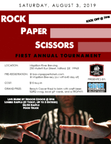 Join us on Saturday August 3rd, 2019 at 7:00 pm at Mispillion River Brewing for our Rock Paper Scissors - First Annual Tournament