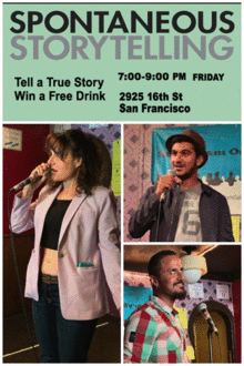 Tell a true story, win a free drink! Spontaneous Storytelling is an event designed to make it easy to meet other people and tell a true story from your life. Or just listen and laugh! Unlike other storytelling shows where you sit in your seat, at Spontaneous Storytelling we have a warmup game so you talk to people first. Once you've met a bunch of new people, it's easy to get up on the mic and tell a true story. People have made new friends and even gotten dates from this event. The host assumes no responsibility for how good the date will be, but it's probably better than Tinder. As a group we pick themes, but we don't know them ahead of time. That's why it's called Spontaneous! And if you've got a great true story that's on a different topic, that's OK too. All we ask is that stories be true, about YOU, and 5 minutes or less. No comedy sets. Everyone who tells a true story, wins a free drink. This show has been going for 5 years already in Oakland, and the SF one is a lot of fun as well. Subscribe at http://www.storyslamoakland.com for discounts and notices about upcoming shows and storytelling events.
