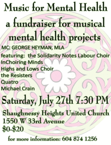 The Solidarity Notes Labour Choir, InChoiring Minds, the Highs and Lows, the Resisters, Quatro, Michael Crain and a special guest (!) are coming together in an extravaganza concert, to raise money to support choirs which provide a space for people with mental health concerns to sing beautiful music together. Earle Peach and Elaine Joe both work with one such choir, the Highs and Lows. This event will also feature a spinning wheel raffle, a wine raffle, and it will be hosted by NDP MLA George Heyman.