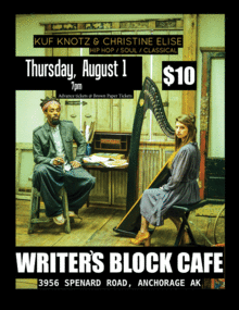 MC/ Poet/ Songwriter Kuf Knotz and classically trained Harpist / Guitarist / Pianist / Vocalist Christine Elise create positive, forward thinking music driven by a strong message. Blending hip hop with classical harp, they build a mesmerizing and dynamic sound that jams and soars and leaves a positively haunting resonance.