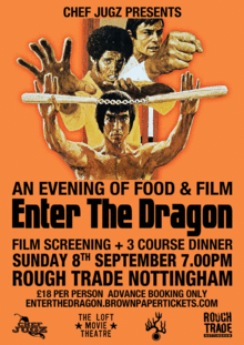 The ticket price includes a screening of the 1973 martial arts action film Enter the Dragon, starring Bruce Lee, John Saxon and Jim Kelly, and a three course meal lovingly prepared by Chef Jugz!