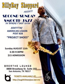 BillyRay Sheppard is back with his Second Sunday Smooth Jazz celebrating summer and the return of Second Sunday. BillyRay and some of San Antonio's finest musicians brings smooth jazz to Breathe Lounge. As always it is a party with a purpose. This edition's charity partner is American Legion Post 828 Project Shoes. You can bring new or gently used shoes in exchange for raffle tickets. You can also bring cash or a check made payable to the charity. Raffle prizes are donated by local businesses. Of course, 100% of the proceeds benefit our charities. Come out and enjoy a night of great fun and superb music.