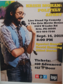 Mohan has also been featured on NPR radio stations in various states (PA, NC, NY). He has also performed and sold out shows at several Fringe Festivals (IndyFringe, Pittsburgh Fringe, Capital Fringe, Philly Fringe Arts), where he has been an audience favorite with his unique brand of comedy & social vigilantism that been described as dangerous perceptive and never offensive. Krish also won the 2018 Pittsburgh Fringe Festival Audience Choice award!