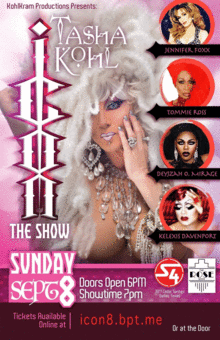 Once again Tasha Kohl brings you the very best in female impersonation. ICON8 includes Legendary Former Miss Gay America Jennifer Foxx, also World Class visuals of Tommie Ross, The High Energy & Avant-garde ...DeyzJah Opulent Mirage & hosted by the Fabulous Kelexis Davenport!!!