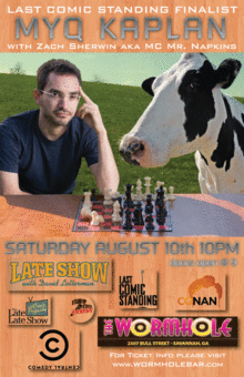 Myq Kaplan is a Last Comic Standing Finalist and has appeared on the Tonight Show, the Late Show with David Letterman, Comedy Central Presents, and Conan. The Comedians magazine calls him "a comedy machine, in the best possible way. the way that some machines vend soda or prevent other machines from killing future revolutionaries that's how Myq Kaplan does comedy: relentlessly, methodically, unblinkingly." His comedy album "Vegan Mind Meld" was a Top 10 iTunes release.