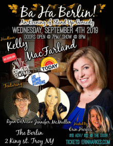 Kelly MacFarland: As an experienced stand-up comedian, Kelly has an extensive and well-rounded resume including comedy clubs, theaters, colleges, festivals, television appearances and entertaining US troops overseas. Kelly was first runner up in the Boston Comedy Festival and voted Best of the Fest at the Aspen Rooftop Comedy Festival. Kelly has two albums available on iTunes, Amazon and SiriusXM radio. She has performed at the Oddball Comedy Festival, the Comedy Stage at Boston Calling Music Festival, Lucille Ball Comedy Festival National Comedy Center and has been a featured headliner for the Boston Women in Comedy Festival since inception. Kelly has appeared on Stand Up in Stilettos on the TV Guide Channel, The Today Show, The View, Comedy Central, NBCs Last Comic Standing and AXS Gotham Comedy LIVE. Kelly won 1st place in the professional category of the 2016 Ladies of Laughter.