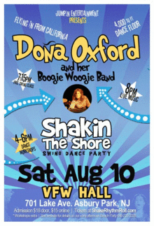 The Shakin At The Shore Dance Party features Dona Oxford and her Boogie Woogie Band on SAT AUG 10th. This one night will showcase Jump, Swing, Boogie Woogie, and Blues, combined with the social dances that fit. In addition, a beach party in the early afternoon, followed by Dance workshops beginning at 4:00pm held at the VFW. FREE SWING Lesson (included in general admission) at 7:15pm. Live Music at 8pm.