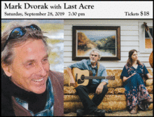 Saturday September 28  7:30 pm  Maple Street Concerts  200 South Main Street  A very special double bill with Mark Dvorak & Illinois own Last Acre.