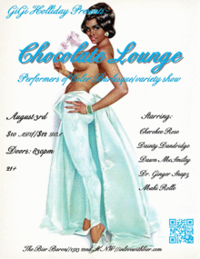 We have all heard of Josephine Baker, but what about Toni Ellington? Lottie the Body? Bronze Blonde Bombshell Ms. Joyce Bryant? Burlesque history is rich, deep and full of performers of color. Yesterday's shake dancers are now today's legends and they have paved the way for today's burlesque beauties. D.C.'s own GiGi Holliday presents Chocolate Lounge. A Performers of Color Burlesque/ Variety show. This revue will display the many talents and beauty of Baltimore and D.C.'s performers of color.