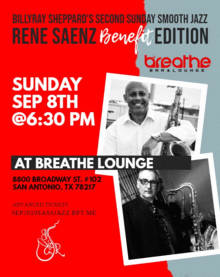 BillyRay Sheppard's Second Sunday Smooth Jazz is always a party with a purpose and this month's concert will be one for the record books. A host of San Antonio's finest musicians will come together to raise funds for one of their own; saxophonist Rene Saenz. Rene is recovering from a stroke and his medical bills are quickly mounting. Imagine a continuous jam session with the city's finest musicians. That is what will be in store on this epic occasion. Every one is donating their time and talent to support their brother Rene. Come out and have fun for a great cause!