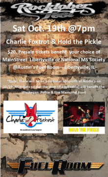 Support worthy nonprofits while enjoying two great local bands! We'll be rocking from 7pm until close with cover tunes performed by local favorites Charlie Foxtrot and Hold the Pickle. 100% of the $20/ticket proceeds will be donated to the nonprofits (as directed by you - the ticket purchasers - upon checkout). Due to space constraints, ticket sales will be limited to 300 total tickets and MUST BE PURCHASED IN ADVANCED. Be sure to buy yours today!