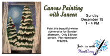 Join us for this beautiful winter scene through lace curtains. Janeen will provide all the supplies and direction needed to paint your own masterpiece. Her paint parties are very well liked and attended, so be sure to purchase your tickets soon. $30 per person.