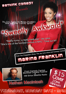 New-York based Marina Franklin has emerged as one of the hottest comedians in the comedy scene today, with such notable appearances on Craig Ferguson's Late Late Show, The Jay Leno Show, Chappelle's Show, Tough Crowd with Colin Quinn, NBC's Last Comic Standing Season II, and Showtime at The Apollo
