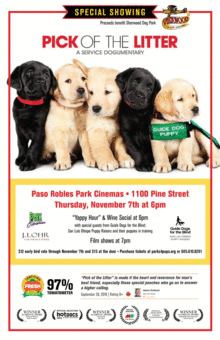 Parks4Pups will host a special film showing of Pick of the Litter, Thursday, November 7 at 6 pm at the Park Cinemas as a fundraiser for Sherwood Dog Park of Paso Robles.